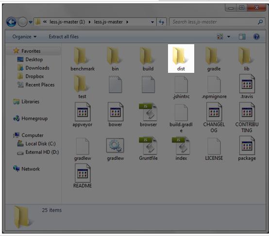 有很多文件和目錄內(nèi) less.js-master目錄,當你打開它但我們只對里面的東西感興趣dist目錄(在開源行話是“分布”的簡稱目錄,生產(chǎn)使用的文件)。