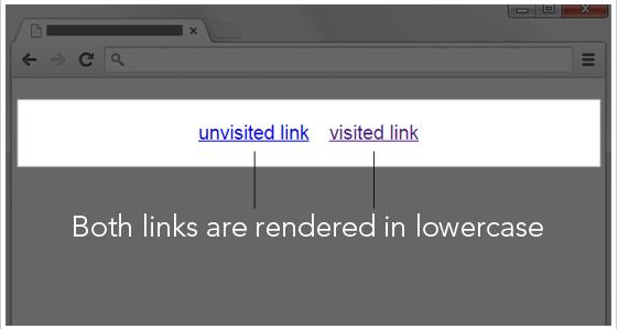 在現(xiàn)代瀏覽器,下面的例子將并不是你所期望的那樣。訪問鏈接不會(huì)呈現(xiàn)全大寫,他們會(huì)在所有的小寫就像未瀏覽鏈接。