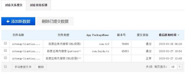您需要在應(yīng)用內(nèi)搜索的提交狀態(tài)查詢頁面點擊“刪除已提交數(shù)據(jù)”按鈕,進入刪除已提交數(shù)據(jù)頁面進行數(shù)據(jù)的刪除操作。直接在已提交的xml地址中刪除指定對應(yīng)關(guān)系并不會成功刪除,只是停止更新。
