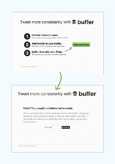 當(dāng)緩沖區(qū)的概念建立一個(gè)更聰明的方式發(fā)布到Twitter和其他社交網(wǎng)絡(luò)了,我們的創(chuàng)始人喬爾Gascoigne立即開(kāi)始編碼,而不是首先驗(yàn)證他的想法。幾分鐘到他的編碼會(huì)話,他意識(shí)到,不是路要走。所以他試了別的東西。他所做的是把一個(gè)著陸頁(yè),如果他的產(chǎn)品已經(jīng)存在,盡管他還沒(méi)有完成一切。