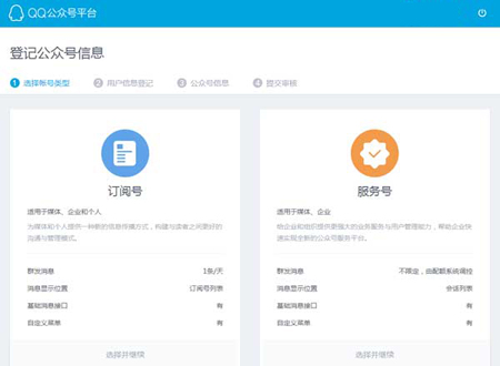 同微信的注冊不同,QQ公眾號可以使用qq登錄即可申請賬號。選擇賬號類型。下面的注冊信息與微信公眾號基本一致了!