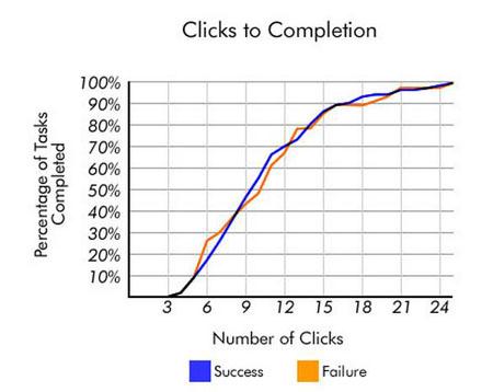 如果有一個(gè)科學(xué)依據(jù)設(shè)定“三次點(diǎn)擊”的原則,我們找不到它在我們的數(shù)據(jù)。我們的分析使我們沒(méi)有任何用戶點(diǎn)擊的次數(shù)之間的關(guān)系和他們的成功找到他們尋找的內(nèi)容。我們的分析表明,沒(méi)有任何用戶退出三點(diǎn)擊后的可能性比12點(diǎn)擊。當(dāng)我們成功的任務(wù)不成功的人相比,我們沒(méi)有發(fā)現(xiàn)差異分布的任務(wù)的長(zhǎng)度。幾乎沒(méi)有人放棄了后三個(gè)點(diǎn)擊。