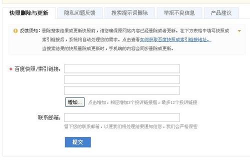 從百度上檢索快照的投訴地址為http://tousu.baidu.com/webmaster/add,一般來說這里需要我們提前來獲取要投訴的快照的地址,然后復制到到索引鏈接中進行提交。如圖: