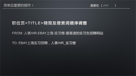 差異性強的屬性,主要是公司名稱,其次再是職位及行業(yè)詞等,因此按公司名稱、職位這樣的順序去寫<title>。根據(jù)經(jīng)驗,諸如將公司名稱寫到<title>左側(cè)這樣的改動,盡管改動非常小,但往往能提高該類頁面至少10%的SEO流量。