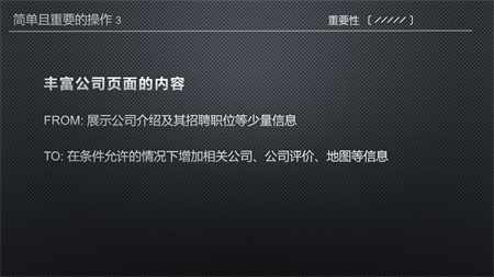對于公司介紹頁面,可添加的較重要的信息如:相關(guān)公司、公司評價……相對次要的信息如:公司具體地址及對應(yīng)地圖、平均薪資……