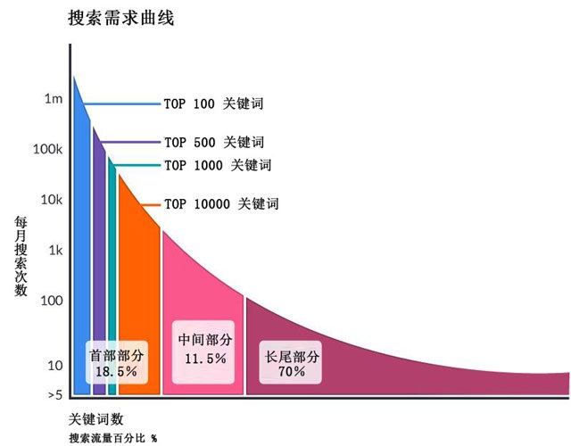 例如,我們處理一個月有50,000次搜索,甚至每月有5,000次搜索的關鍵詞非常好,但是實際上,這些流行的搜索詞只占在網絡上執(zhí)行的所有搜索的一小部分。實際上,搜索量非常大的關鍵詞甚至可能表明意圖不明確,如果我們定位這些字詞,則可能使我們吸引那些訪問目標與頁面內容不匹配的訪問者。其余75%位于搜索的“中間部分詞”和“長尾詞”。不要小看這些不太受歡迎的關鍵詞。搜索量較低的長尾關鍵詞通常會帶來更好的轉化,因為用戶的搜索更加具體和有意。